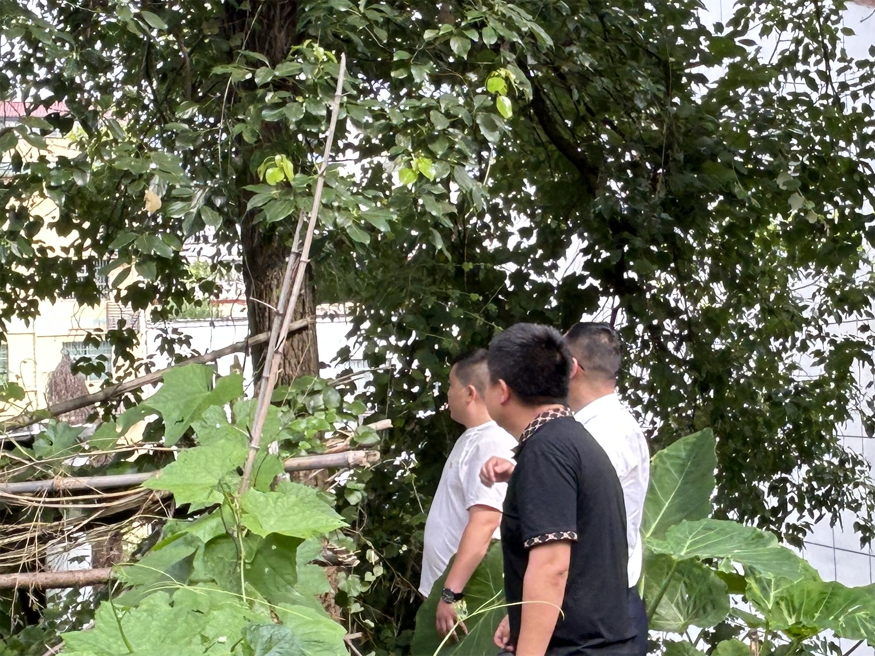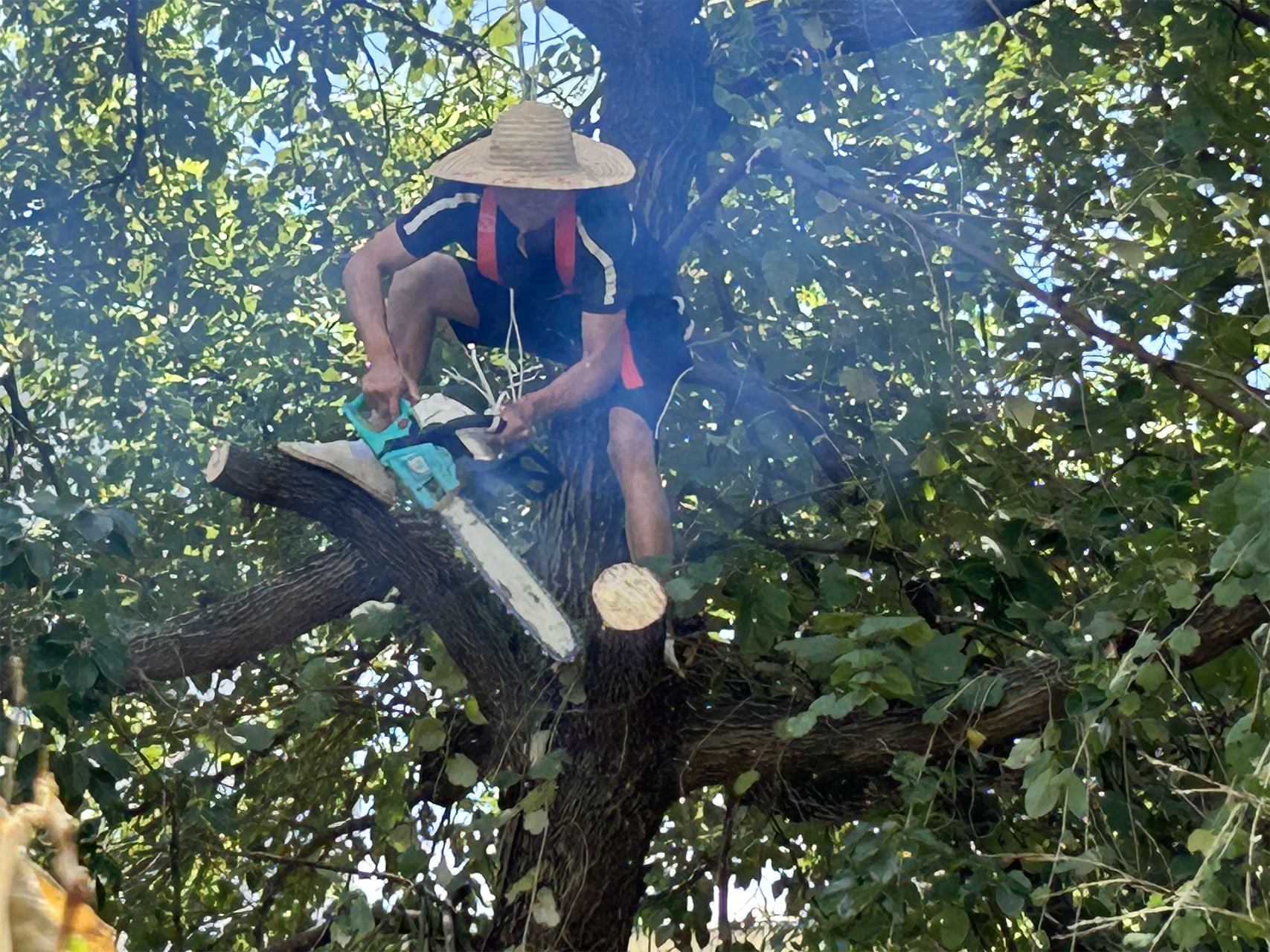 工作人員頂著35℃的高溫,爬到樹干,系上安全繩,將枝條套上繩索一根一根進(jìn)行逐步分解,樹下人員用盡全力一根一根往邊坡上拉,防止掉落的樹枝砸到居民房屋。歷經(jīng)兩個(gè)半小時(shí),終于把大樹安全伐倒,并將殘枝全部處理到位,消除了隱患。