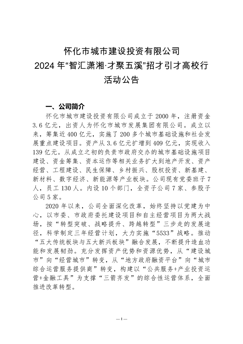 懷化市城市建設(shè)投資有限公司2024年“智匯瀟湘·才聚五溪”招才引才高校行活動(dòng)公告