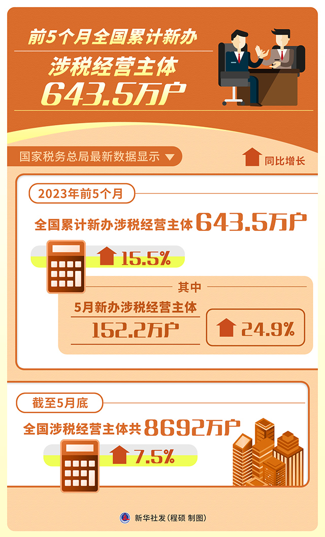 國家稅務(wù)總局最新數(shù)據(jù)顯示,2023年前5個月,全國累計新辦涉稅經(jīng)營主體643.5萬戶,同比增長15.5%。其中,5月新辦涉稅經(jīng)營主體152.2萬戶,同比增長24.9%。截至5月底,全國涉稅經(jīng)營主體共8692萬戶,比去年同期增長7.5%。