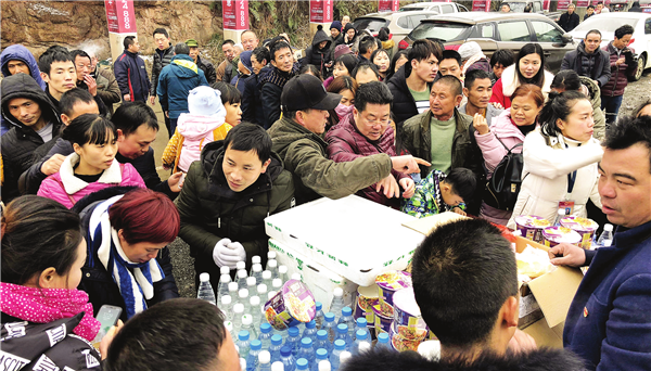 1月28日,洪江市組織工作人員在邵懷高速公路安江出口為被困乘客免費發(fā)放餅干、方便面和飲用水等食品。由于嚴(yán)寒低溫天氣,邵懷高速洪江市路段大面積結(jié)冰,安江出口20 余輛大巴車被困。該市立即調(diào)撥救援物資,幫助被困群眾。(楊錫建 向華 攝)