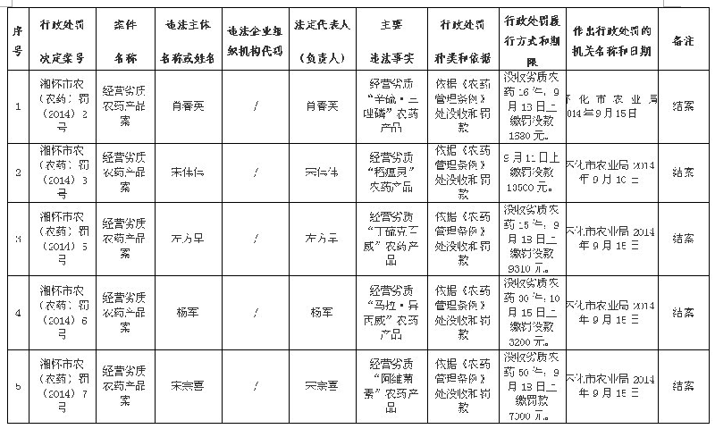 2014年懷化市農業(yè)局農業(yè)行政處罰案件