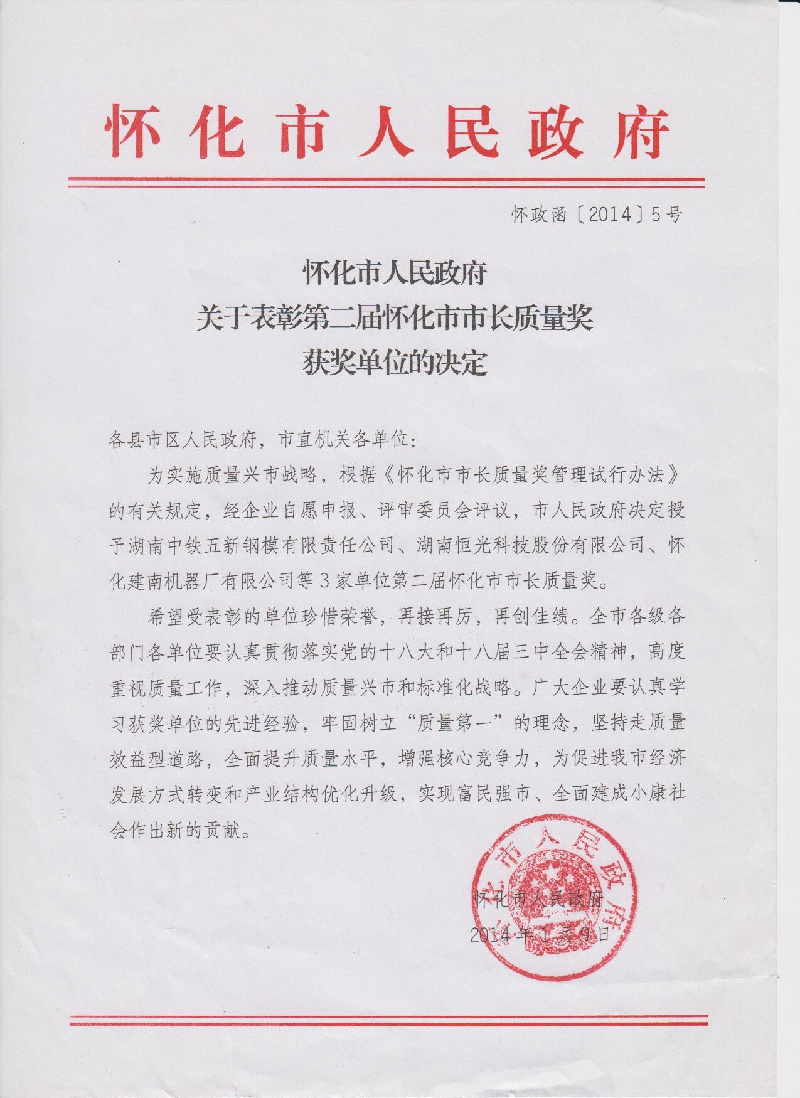 自2011年頒發(fā)首屆懷化市市長(zhǎng)質(zhì)量獎(jiǎng)以來(lái),全市各級(jí)各部門(mén),各企業(yè)迅速掀起了質(zhì)量興市熱潮,廣泛開(kāi)展了學(xué)習(xí)貫徹落實(shí)以《卓越績(jī)效評(píng)審準(zhǔn)則》國(guó)家標(biāo)準(zhǔn)和市內(nèi)外先進(jìn)企業(yè)成功質(zhì)量管理經(jīng)驗(yàn)為重點(diǎn)的質(zhì)量強(qiáng)市活動(dòng),我市質(zhì)量工作得到了很好的發(fā)展,為進(jìn)一步推進(jìn)質(zhì)量興市戰(zhàn)略,2013年我市根據(jù)《懷化市市長(zhǎng)質(zhì)量獎(jiǎng)試行管理辦法》的有關(guān)規(guī)定,經(jīng)企業(yè)自愿申報(bào)、評(píng)審委員會(huì)評(píng)議,市人民政府決定,授予湖南中鐵五新鋼模有限責(zé)任公司、湖南恒光科技股份有限公司、懷化建南機(jī)器廠有限公司等3家單位第二屆懷化市市長(zhǎng)質(zhì)量獎(jiǎng)。