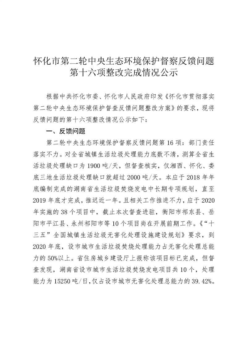 懷化市第二輪中央生態(tài)環(huán)境保護督察反饋問題第十六項整改完成情況公示