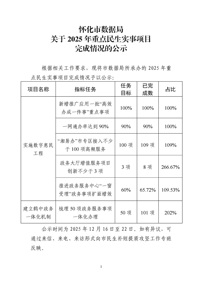 懷化市數(shù)據(jù)局關于2025年重點民生實事項目完成情況的公示