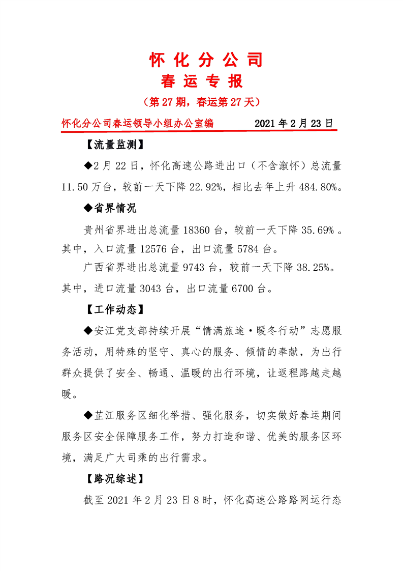 省高速集團(tuán)懷化分公司第27期春運(yùn)專報(bào)