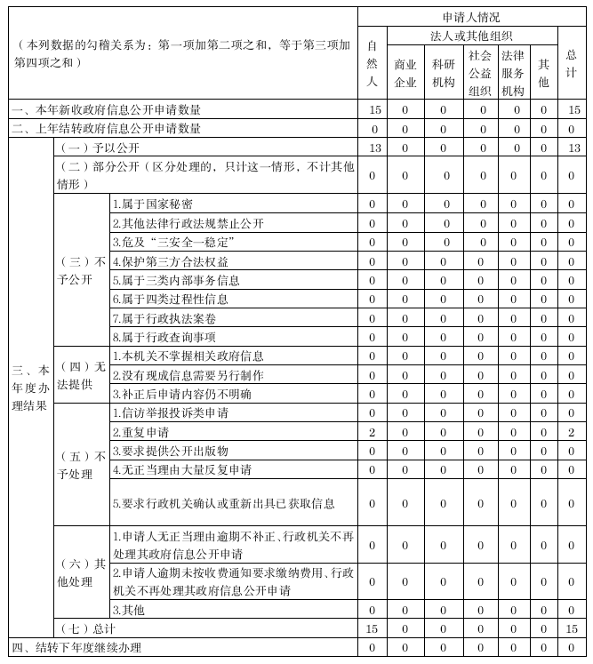 全年收到15信息公開(kāi)申請(qǐng),均已按時(shí)辦結(jié)。在行政復(fù)議、訴訟方面,也未收到有關(guān)政府信息公開(kāi)的行政復(fù)議申請(qǐng),也未發(fā)生關(guān)于政府信息公開(kāi)的行政訴訟案件。