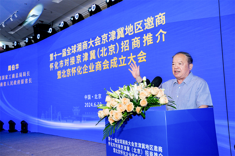 6月23日下午,第十一屆全球湘商大會京津冀地區(qū)邀商、懷化市對接京津冀(北京)招商推介暨北京懷化企業(yè)商會成立大會在北京舉行。圖為原國家工商總局局長、湖南省政府原省長周伯華出席并講話。(懷化日報全媒體記者 潘雨 攝)
