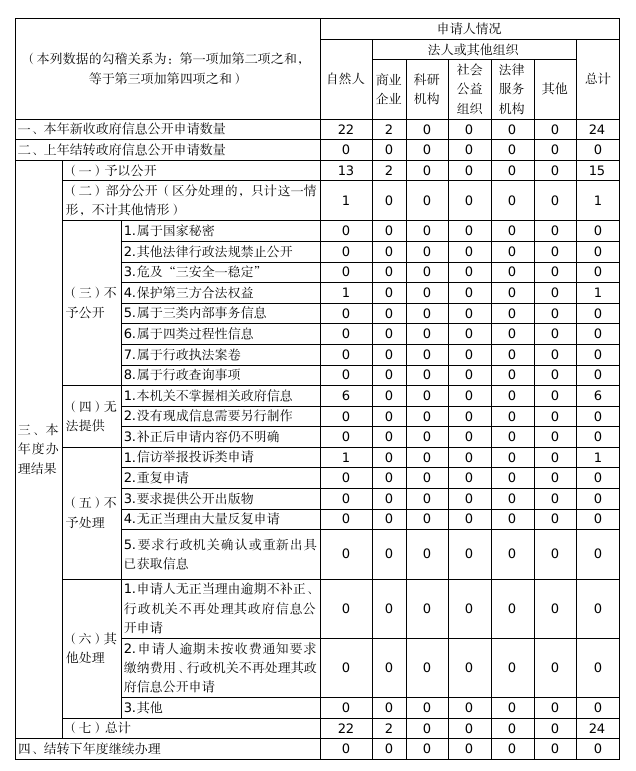 嚴(yán)格執(zhí)行政府信息公開條例有關(guān)依申請(qǐng)公開的規(guī)定,依法辦理政府信息公開申請(qǐng)件。全年收到9件線上信息公開申請(qǐng)、15件線下信息公開申請(qǐng),均已按時(shí)辦結(jié)。在行政復(fù)議、訴訟方面,也未收到有關(guān)政府信息公開的行政復(fù)議申請(qǐng),也未發(fā)生關(guān)于政府信息公開的行政訴訟案件。